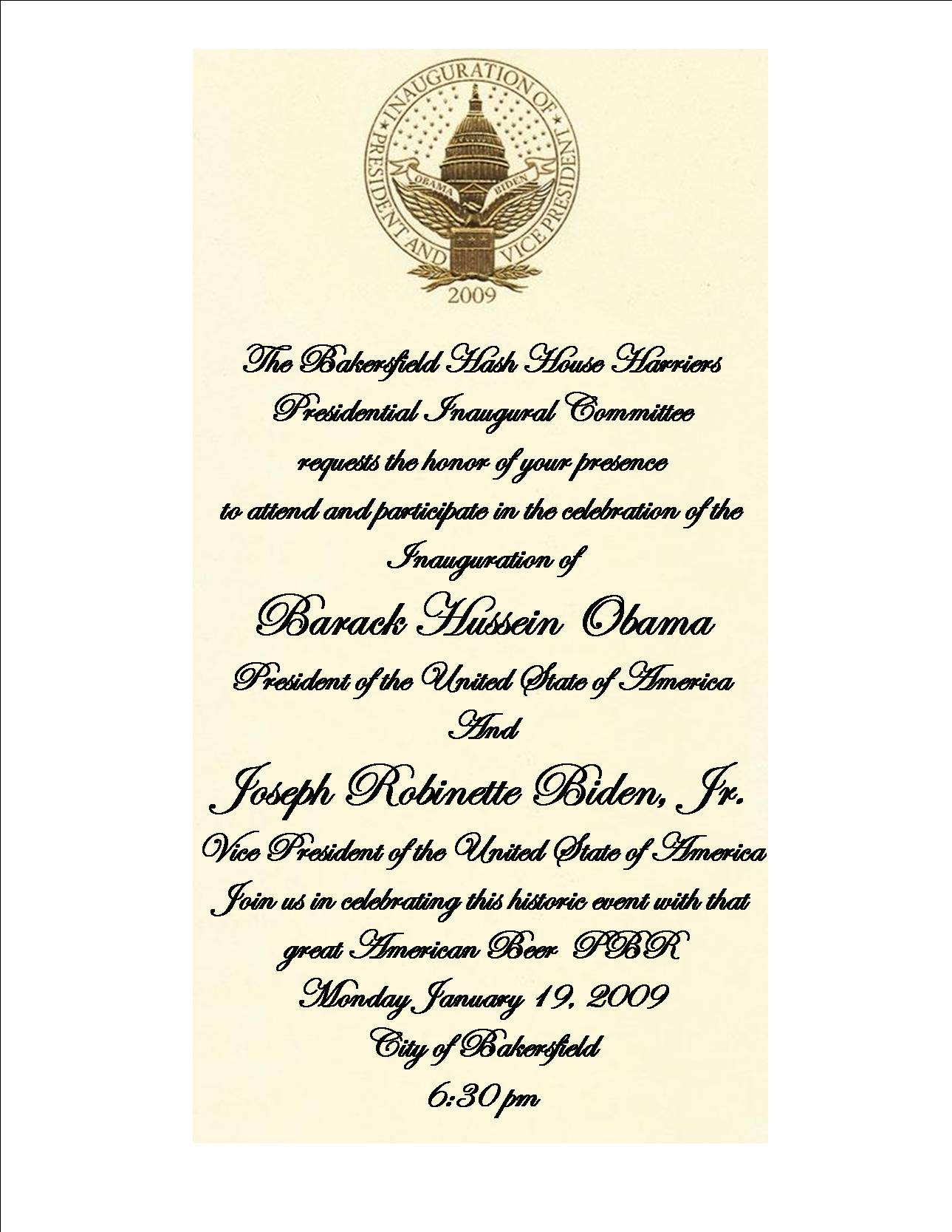 The Bakersfield Hash House Harriers Presidential Inaugural Committee requests the honor of your presence