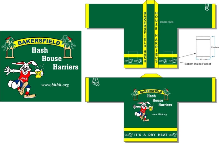 Wanks, I have been busy arranging a design for our very own Hash Hapi Coats. You may remember our visiting Hashers from our Mother Hash, Houston, wearing theirs on their last visit. These are for lounging at the down, down circle after the runs.