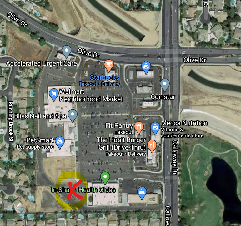 Map to the starting location at this link: https://www.google.com/maps/place/In-Shape+Health+Clubs/@35.4114297,-119.1131152,562m/data=!3m1!1e3!4m13!1m7!3m6!1s0x80ea6bc8b994cb0d:0x59360c0998fe74c8!2sBakersfield,+CA!3b1!8m2!3d35.3732921!4d-119.0187125!3m4!1s0x80ea433ea03d4489:0xeffa9e37ce653d5!8m2!3d35.4103773!4d-119.1114937