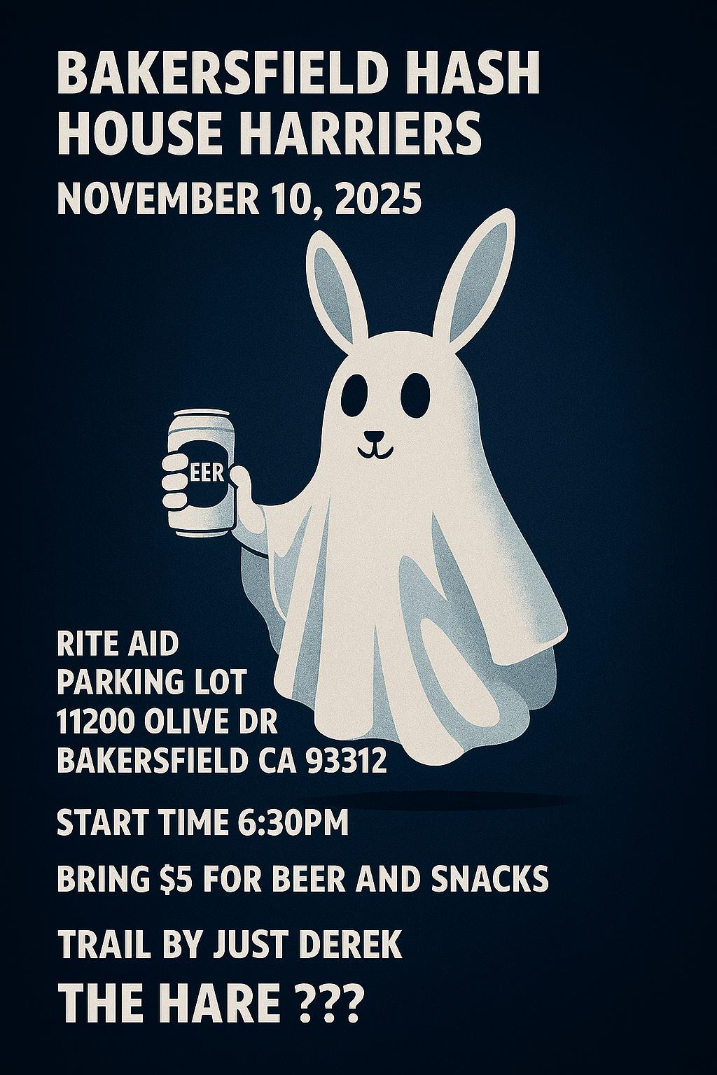 The Ghost of Just Derek has laid the trail for the November 10, 2025 Hash. Someone will need to be the designated Hare to pass out Beer/Snacks at the beer stops.